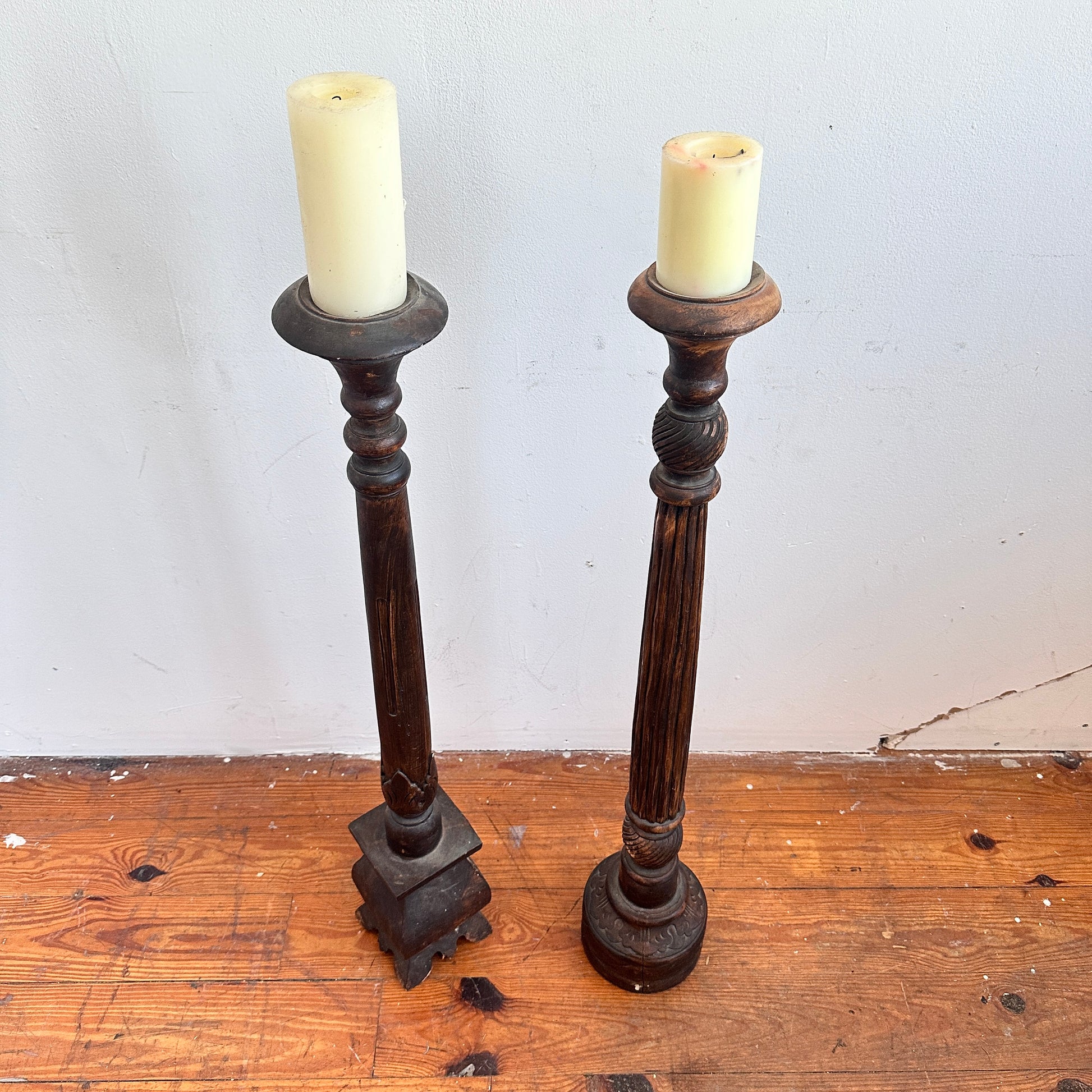 CA044 PAIR OF ANTIQUE WOODEN OVERSIZED CANDLE HOLDERS